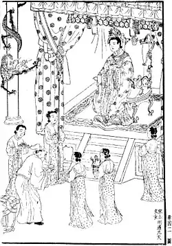 In the Ming dynasty, Jiutian Xuannü officially became a celestial protectress and was venerated as a tutelary goddess of the state.[11] In 1493, Empress Zhang (1470–1541), who was the wife of the Hongzhi Emperor, was ordained and her ordination was certified in a scroll entitled The Ordination of Empress Zhang, which contains numerous images of deities (but not Jiutian Xuannü) and an inscription composed by the Daoist master Zhang Xuanqing (張玄慶, d. 1509) of the Zhengyi school.[11] This inscription ranks Jiutian Xuannü above all other celestial warriors by placing her ahead of the divine categories Generals, Marshals, Heavenly Soldiers, the Six Ding Jade Maidens, and the Six Jia Generals.[11] Furthermore, it granted her the expanded official title Jiutian Zhanxie Huzheng Xuannü (九天斬邪護正玄女, translated "Dark Lady of the Nine Heavens who Slays Evil and Protects Righteousness").[11] The Lingbao Liuding Mifa associates the phrase "slaying evil and protecting righteousness" (斬邪護正) with the goddess and emphasizes that "in order to slay evil and return to righteousness, one first needs to know how to become invisible" (斬邪歸正,先須知隱形).[11]