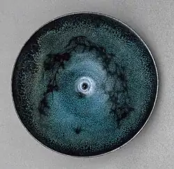 Jizhou ware was known for a "tortoiseshell glaze" (玳瑁釉 dàimàoyòu),[5][6] alone or in combination with other types of decoration.[7] The leaf and paper cut-outs were left in place, and burnt away in the kiln during firing. Paper cut-outs featured "auspicious characters" or simple floral patterns, often spread around the sides of the bowl. The leaves were more often placed in the centre of the bowl, and often only the skeleton of the leaf is seen.[8] The technique seems to have been to soak a real leaf in the glaze mixture, then place it on the vessel, where the leaf itself burnt away in firing.[9] Another, rather rare, resist glaze effect is called "leopard-spot".[10] "Deer-spot" decoration, with rows of light brown spots with a white centre, was painted into place.[11]