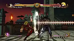 Attacking and receiving damage fills up a player's Heart Heat Gauge (ハートヒートゲージ, Hāto Hīto Gēji) which, when filled to either one or two levels, allows players to perform powerful Heart Heat Attacks (ハートヒートアタック, Hāto Hīto Attakku; HHA) or Great Heat Attacks (グレートヒートアタック, Gurēto Hīto Attaku; GHA), depending on how much their gauge is filled and which multiple button input is chosen. Players can decrease their opponent's Heart Heat Gauge by using taunts when they are knocked down. Players can also use Flash Cancels[α] to deplete their own Heart Heat Gauge to cancel their current combo attack and chain into a new one.[4] The Heart Heat Gauge is also used in some Battle Styles and certain special techniques. Rush Mode (ラッシュモード, Rasshu Mōdo), similar to the "Blazing Fists Match" system of Capcom's 1998 fighting game based on the series, occurs when two "Rush" attacks collide with each other, beginning a button mashing minigame. When a character's Stamina is low, the character enters one of two modes to turn the tide of the match: Rumble Mode (ゴゴゴモード, Gogogo Mōdo), which increases the character's attack strength and Heart Heat Gauge restoration, and Resolve Mode (覚悟モード, Kakugo Mōdo), which in addition to the bonuses from Rumble Mode adds a temporary invincible armor as well. Novice players can use the Easy Beat (イージービート, Ījī Bīto) system, which allows them to more easily string together combos and techniques by using only a single button. Along with the stamina gauge, players also have a Guard Gauge (ガードゲージ, Gādo Gēji) which depletes when they block attacks, causing them to become vulnerable if it is completely drained in a Guard Crush (ガードクラッシュ, Gādo Kurasshu). The Guard Gauge is also depleted by Stylish Evades,[β] special dodges that when executed properly make the character perform one of their iconic poses from the manga. The remaster adds three new mechanics; Assist Attacks, in which players can summon another character for an attack, Air Dash, which lets fighters dash in the air, and Stylish Guard, which lets players dodge attacks at the last second.[5]