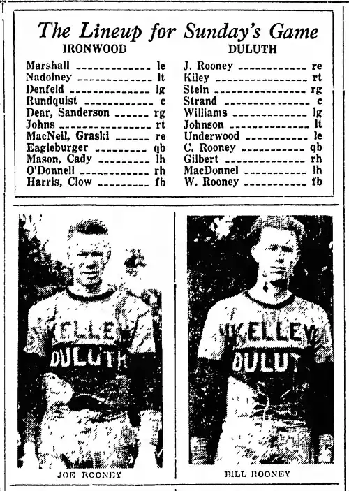 Joseph Patrick Rooney (August 28, 1898 – March 4, 1979) was a Canadian-born American professional football player. After attending high school in Virginia, Minnesota, Rooney made his professional debut in the early years of National Football League (NFL) in 1923 for the Kelley–Duluth club. He played for the Kelleys, Duluth Eskimos, Chicago Cardinals, Pottsville Maroons and Rock Island Independents during his 7-year career.[1]