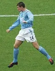 Barton would have made his debut for the City first team in November 2002 against Middlesbrough, had he not lost his shirt after leaving it on the substitutes bench at half-time.[21] He eventually made his first-team debut for the club against Bolton Wanderers on 5 April 2003.[22] His first senior goal came two weeks later in a 2–0 win over Tottenham Hotspur on Good Friday.[23] He ended the 2002–03 season with a run of seven consecutive starts.