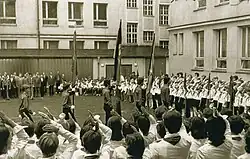 School life changed tremendously during World War II. Young teachers were conscripted in 1939 and 1940 so that older teachers taught two classes at the same time. Additionally, students from the Diesterweg School had been incorporated. Parts of the basement had been converted to be used as a dugout and were located where the fitness room is nowadays. After the raid on Poland and a growing fear of chemical warfare, the decontamination squad was deployed in the basement of the school building as well. In January and February 1940, the school had to close because of the freezing temperatures in the classrooms and the absence of heating fuel. Students were required to keep a diary with their experiences about the war and to collect donations. The school garden was used to cultivate vegetables to feed the people. In the school year of 1942 and 1943, sirens were installed on the roof to warn students and people living near the school. If possible, students were sent home after hearing the pre-alarm. At the beginning of 1945, the first refugees came and two classrooms of the boys school were furnished for the homeless. Parts of the girls school served as a sickbay. For 37 classes with up to 40 students each, there were only 20 rooms available anymore. Lessons were shortened or sometimes even shut down because of missing heating fuel. With the beginning of air raids, the school was completely shut down. The bombings destroyed the protectory right next to school and killed 39 children. The windows, the whole tower and parts of the roof were destroyed. Several classrooms caught fire. In the following months, only teachers were allowed to enter the school building to start clearing work. 22 students who attended the school died during the war.