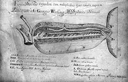 Wirsung was born in Augsburg, Bavaria, and much of his early life is unknown as the archives of Padua were destroyed in 1737. Wirsung's father was a physician in Bavaria and his mother came from a wealthy family. He studied anatomy in Paris under Jean Riolano.[1] He became a prosector under Johannes Wesling in Padua. and served in the position for 14 years. He is remembered for the discovery of the pancreatic duct ("duct of Wirsung") during the dissection of a man who had been recently hanged for murder. The duct was earlier noted in 1641 in a rooster by another student of Wesling named Moritz Hofmann (1621-1698). Instead of publishing the results of his discovery, he engraved a sketch of the duct on a copper plate, from which he made several imprints, and subsequently had them delivered to leading anatomists throughout Europe. Wirsung also described the duct in a letter to Jean Riolan who named the duct as the duct of Wirsung.[2]