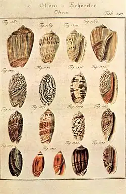 Conchylien-Cabinet von Martini und Chemnitz is an enormous work published from 1837 up to 1920 with nearly hundred sections, including some 4000 plates. The original work was continued by Heinrich Carl Küster and then Wilhelm Kobelt and Heinrich Conrad Weinkauff.[4][5]