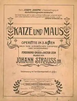 Despite Strauss’ keen interest in composing, he was better remembered as a conductor. His only stage work, the three-act operetta Katze und Maus, composed in 1898, premiered in Vienna on 23 December 1898, at the Theater an der Wien.[1] Its public reaction bordered on utter dislike, and music critics called for the distraught composer to reassess himself and to appear under a pseudonym, in order not to tarnish the name of his famous relatives. He salvaged the music score and produced independent pieces of which the waltzes Sylvanien, Op. 1 and Leonie, Op. 2 survived obscurity.