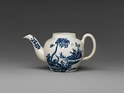No high quality porcelain was being produced in America at the time, only basic stoneware. Luxury porcelains with underglaze blue decoration had to be exported to wealthy colonists in America from Britain. However suitable kaolin deposits had been discovered in the 1730s in the Carolinas, and some clay was even being shipped to England from Charleston.[1] Bartlam first began his pottery enterprise in 1765 in Cain Hoy, employing African-Americans as apprentices in the business. Bartlam moved his business to Camden, South Carolina in 1772 where there were plentiful supplies of kaolin.[2] From there he exported Queen's Ware “equal in quality and appearance and can be afforded as cheap, as any imported from England.” [3] His products were regarded as a threat by Josiah Wedgwood.[1]