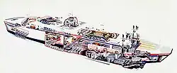 ![]() A cutaway illustration of a ferry by Batchelor, showing trademark shading effects, red infill on the "cut" surfaces, and detailing | |