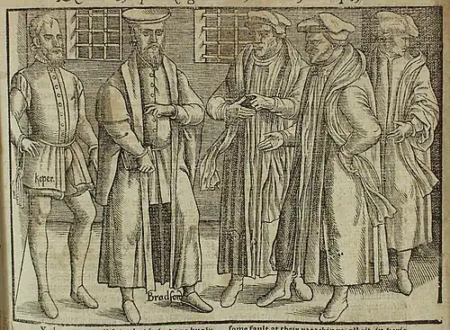 - ^ From an 1887 edition of Foxe's Book of Martyrs illustrated by Kronheim. According to Foxe, a Catholic speaker, Mr. Bourne, had nearly driven his Protestant listeners to riot, but Bradford came to his rescue and calmed the mob.