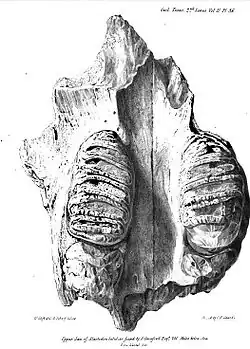 The expedition fortuitously was delayed on the return journey for repairs. Crawfurd collected significant fossils, north of Magwe on the left bank of the river, in seven chests. Back in London, William Clift identified a new species of mastodon (more accurately Stegolophodon) from them;[25] Hugh Falconer also worked on the collection.[26] The finds, of fossil bones and wood, were discussed further in a paper by William Buckland, giving details;[27] and they brought Crawfurd the friendship of Roderick Murchison, Foreign Secretary of the Geological Society.[28] There were also collected 18,000 botanical specimens, many of which went to the Calcutta Botanic Garden.[29]
