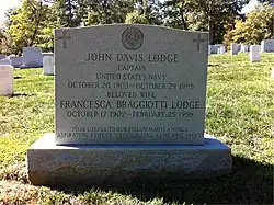 He was married July 6, 1929 to actress and ballet dancer Francesca Braggiotti; both of them appearing in the 1938 film Tonight at Eleven. They had two daughters, Lily and Beatrice. Lily Lodge is the director of the Actors Conservatory, and Beatrice is married to Antonio de Oyarzabal, the former ambassador of Spain to the United States. He was a resident of Westport, Connecticut until his death in New York City. Lodge was interred in Arlington National Cemetery.[9] Two months after his death, the Connecticut Turnpike was renamed the Gov. John Davis Lodge Turnpike in his honor.