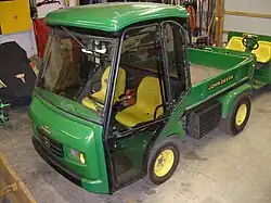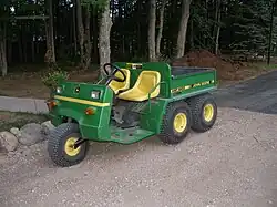 The John Deere Gator is a family of small all-terrain utility vehicles produced by the John Deere Corporation. Gators typically feature a box bed, similar in function to a pickup truck. The bed can also be installed as an electric dump body. The John Deere Gator has been made in a variety of configurations, with either four, five or six wheels.[1] The Gator line of vehicles are designed to serve on farms, worksites, and ranches, rather than as a pure off-road vehicle. However, it is possible to order with specific off-road features. Introduced in 1992, the vehicle replaced the five-wheeled John Deere AMT line introduced in 1987.[2]