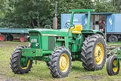 The John Deere 4020 was an agricultural tractor model made by John Deere from 1964 to 1972. It replaced the nearly identical 4010 that had been introduced with Deere's New Generation series in 1960 and offered a number of improvements over the previous model including more horsepower, heavier rear axles, and a differential lock. The 4020 was produced with three engine options: diesel, petrol, and LPG. The 4020 Diesel has a six-cylinder engine tested at 84 drawbar and 91 PTO horsepower.[1] John Deere's Syncro Range transmission with 8 forward speeds and two reverse speeds was standard, a power shift transmission was optional. Other options included dual rear wheels and an enclosed cab with heat and air conditioning. The 4020 is significant for its great popularity; over 184,000 units were built.[2] It was the most popular tractor of its time.[3]