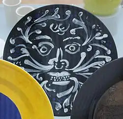 In 1968, Piper began making ceramic dishes and plates. At Fawley Bottom for many years, Piper shared a studio with the potter Geoffrey Eastop, who helped him with technical aspects of the process.[50] A number of Piper's ceramics are now in the collection of the Victoria and Albert Museum in London.[51][52] One of Piper's last commissions was executed in this medium, when, in 1990, the Art Fund commissioned Piper and five other contemporary artists to design a collection of plates for Wedgwood. The other plates were designed by Peter Blake, Patrick Caulfield, Patrick Heron, Bruce McLean and Eduardo Paolozzi. Piper's plate features a recurrent image in his oeuvre, the foliate head of The Green Man.[53]