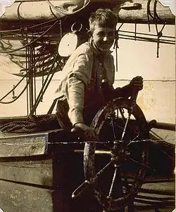John F. Leavitt was born to the sea.[1] His Maine family were sailors, as reflected in early photographs showing his seven-year-old sister Syrena and him at the wheel of the Alice S. Wentworth in Lynn, Massachusetts.[2] Leavitt himself was a crew member on several coastal schooners in Maine beginning in 1918 until about 1925, the tail end of the schooner era.[3]