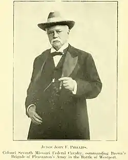 During the Battle of Westport, Philips was placed in command of a brigade when his superior, Brigadier General Egbert Brown, was placed under arrest by Major General Alfred Pleasanton for not promptly attacking at Byram's Ford.[4] Continuing in command after having taken the ford, Philips' brigade played a key role in the crushing victory at Mine Creek two days later. According to his diary he suffered an irritating wound to his right eye during the battle.[5]