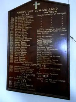 - ^ a b c Per list of vicars displayed painted on a wooden board in Knowstone Church