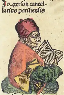 Jean Charlier de Gerson (13 December 1363[1] – 12 July 1429) was a French scholar, educator, reformer, and poet, Chancellor of the University of Paris, a guiding light of the conciliar movement and one of the most prominent theologians at the Council of Constance. He was one of the first thinkers to develop what would later come to be called natural rights theory, and was also one of the first individuals to defend Joan of Arc and proclaim her supernatural vocation as authentic.[2][3]