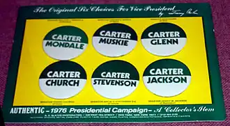 After Jimmy Carter became the presumptive Democratic nominee for president in the 1976 election, Glenn was reported to be in consideration to be Carter's running mate because he was a senator in a pivotal state and for his fame and straightforwardness.[141] Some thought he was too much like Carter, partially because they both had military backgrounds, and he did not have enough experience to become president.[142] Barbara Jordan was the first keynote speaker at the Democratic National Convention. Her speech electrified the crowd and was filled with applause and standing ovations. Glenn's keynote address immediately followed Jordan's, and he failed to impress the delegates. Walter Cronkite described it as "dull", and other delegates complained that he was hard to hear.[143] Carter called Glenn to inform him the nomination was going to another candidate and later nominated the veteran politician Walter Mondale. It was also reported that Carter's wife thought Annie Glenn, who had a stutter, would hurt the campaign.[144][145]