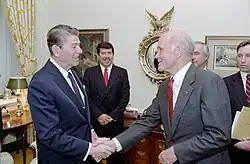 In 1973, President Nixon ordered Attorney General Elliot Richardson to fire Watergate special prosecutor Archibald Cox. Richardson refused and resigned in protest, triggering the Saturday Night massacre. Ohio Senator William Saxbe, elected in 1968, was appointed attorney general. Both Glenn and Metzenbaum sought the vacated seat, which was to be filled by Governor John Gilligan. Gilligan was planning on a presidential or vice-presidential run in the near future, and offered Glenn the lieutenant governor position, with the thought that Glenn would ascend to governor when Gilligan was elected to a higher position. The Ohio Democratic party backed this solution to avoid what was expected to be a divisive primary battle between Metzenbaum and Glenn. He declined, denouncing their attempts as "bossism" and "blackmail".[120] Glenn's counteroffer suggested that Gilligan fill the position with someone other than Metzenbaum or Glenn so neither would have an advantage going into the 1974 election. Metzenbaum's campaign agreed to back Gilligan in his governor re-election campaign, and Metzenbaum was subsequently appointed in January 1974 to the vacated seat.[120] At the end of Saxbe's term, Glenn challenged Metzenbaum in the primary for the Ohio Senate seat.[138]