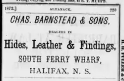 John Henry Barnstead first appears in Halifax City Directories in 1866, at age 19, listed as a "bookkeeper" at his father's address on Spring Garden Road.[7] He remains listed as a bookkeeper until 1870, when he appears along with his brother and father listed as "Barnstead & Sons, leather manufacturers" at Steamboat Wharf.[8] The "s" in sons did not last, and in McAlpine's Halifax City Directory, 1874, Barnstead was listed separately from his father and older brother Charles. They were noted as "Charles Barnstead and Son, Tanners", while Barnstead was listed as "Barnstead, John H, leather, &c"[9] Despite this, Barnstead remained in the leather business, noted as "tanners & curriers", and also as a "leather dealer" until at least 1884,[10]