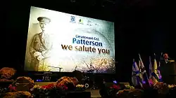 Alan Patterson, the Jewish American Society for Historic Preservation, Canadian representative Todd Young, Beit HaGedudim (the museum of the Jewish Legion), and the moshav (village) of Avihayil (represented by Ezekiel Sivak) began a coordinated effort to honour this request in 2010. With the assistance and support of the Israeli government and Prime Minister Benjamin Netanyahu, on 4 December 2014, the remains of Patterson and his wife were re-interred in the Avihayil cemetery where some of the men he commanded are buried. Attending the ceremony were Prime Minister Netanyahu, members of his family, military and cabinet members of the Israeli government, the British Ambassador, the Irish Ambassador, Alan Patterson, Jerry Klinger of the Jewish American Society for Historic Preservation, Ezekiel Sivak of Avihayil, representatives and descendent family members of the Jewish Legion, Christians supporters of Israel, 350 guests and numerous other dignitaries.[29] Netanyahu referred to Patterson as "the godfather of the Israeli army" and "a great friend of our people, a great champion of Zionism and a great believer in the Jewish State and the Jewish people... I feel it is an obligation of our people, our State and mine personally to fulfil his testimony".[30][31][32][33]