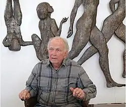 Waddell with his work, That Which Might Have Been, Birmingham 1963, Unitarian Universalist Congregation of Phoenix, cast in 1964. Photographed in 2013.