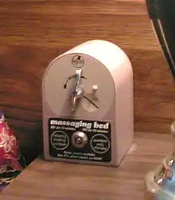 In the 1950s, Houghtaling was still working as a salesman, this time selling vibrating beds in which the vibrating motor and bed were sold as a single unit that was clumsy, expensive, and prone to failure.[1] At a service call for a broken unit, Houghtaling realized that the vibrating motor was the essential component, not the bed, and that a unit could be developed that would attach to any bed, not just the combination vibrating bed units he was selling.[3] Houghtaling worked in the basement of his home in Glen Rock, New Jersey, and tested hundreds of motors before finding one that weighed relatively little, could be attached to the box springs of an existing bed, and would provide the right level of vibration. Once a quarter was inserted into the attached coin meter, the motor would vibrate the bed for 15 minutes.[1] The coin mechanisms were modeled on similar devices that had been attached to radios and televisions in hotels.[3] The devices were sold through franchisees who installed the units in hotels based on an arrangement in which revenues would be split, with $1 million in annual sales of the units. There were 250,000 Magic Fingers units installed nationwide at their peak of popularity in the 1960s, with each unit averaging eight quarters per week, bringing in $2 million in monthly gross revenue.[4]