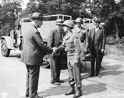 General Collier's decorations included multiple awards of the Distinguished Service Medal, two awards of the Silver Star, and multiple awards of the Legion of Merit and Bronze Star.[28][29][30] At the end of World War II, the Union of Soviet Socialist Republics decorated him with the Order of Alexander Nevsky as the 2nd Armored Division linked up with elements of the Red Army.[31]