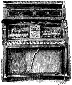 There had been upright grand pianos as well as upright harpsichords, the horizontal instrument being turned up on its wider end and a keyboard and action adapted to it. William Southwell, an Irish pianomaker, had in 1798 tried a similar experiment with a square piano, to be repeated in later years by William Frederick Collard of London; but Hawkins was the first to make a piano, or pianino, with the strings descending to the floor, the keyboard being raised. His instrument was in a complete iron frame, independent of the case; and in this frame, strengthened by a system of iron resistance rods combined with an iron upper bridge, his sound-board was entirely suspended. An apparatus for tuning by mechanical screws regulated the tension of the strings, which were of equal length throughout. The action, in metal supports, anticipated Robert Wornum's in the checking, and later ideas in a contrivance for repetition. This bundle of inventions was brought to London and exhibited by Hawkins himself; but the instrument was poor in tone.[25]
