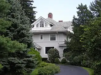 The house sites on a 100-by-298-foot (30 m × 91 m) lot (roughly 0.75 acres (0.30 ha)). It is a 2+1⁄2-story residence, approximately 31 by 47 feet (9.4 m × 14.3 m). When remodeled in 1910, the exterior was painted with a light-grey Portland cement stucco. This is accented with darker-grey wood-and-metal trim. The front of the house faces the west. A large picture window 7 by 5 feet (2.1 m × 1.5 m) and two casement art glass windows decorate the facade. The second floor of this side has two double-hung windows, one of which remains from the original 1888 construction. The entrance is under a gabled portico with a slight pitch and decorative wood details. The portico columns are stucco with white trim. Dark-grey steps lead to a landing with two built-in bench seats. Copper gutters on this side have been painted white. The north side has a gabled projection that extends 4 feet (1.2 m); the projection extends slightly farther on the second and third floors. The east (rear) elevation features a rear entrance with a small porch. A second-floor porch is supported with wood columns with Doric capitals. The south side features the veranda with fitted screens and storm windows on three sides. A 1910-door leads from the veranda to the interior dining room. A garage and gazebo were recently constructed on the property.[1]