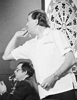 John Lowe MBE (born 21 July 1945) is an English former professional darts player. Along with Eric Bristow and Jocky Wilson, he was known for dominating darts during the 1980s. Lowe was world champion on three occasions, in 1979, 1987 and 1993. He was also a two-time winner of the Winmau World Masters and a two-time World Cup singles champion. In total, Lowe won 15 BDO and WDF majors. He held the World No. 1 ranking on four occasions. In October 1984, he became the first player to hit a televised nine-dart finish.