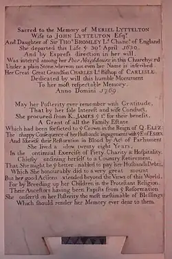 ![]() St John the Baptist Church, Hagley, monument to Meriel Bromley, the wife of Sir John Lyttelton, with a remarkable anti-Catholic inscription | |