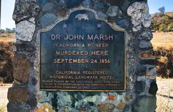 Marsh was active in California politics. On September 24, 1856, he began a journey from his land in eastern Contra Costa County to San Francisco for a personal or political appointment. On the road between Pacheco and Martinez, he was ambushed and murdered[7] by three of his vaquero employees over a dispute about their wages. Initially the three men escaped. Two of the killers were found ten years later and brought to trial. One man turned state's evidence and was released without trial. The other was convicted and sentenced to life in prison, though he was pardoned 25 years later. The third man was never caught.[37] A California Historical Landmark (#722) plaque marks the site of the murder.