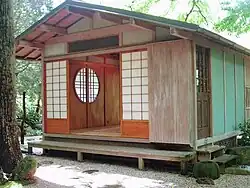 Upon return from a trip to Kyoto, Japan in 1960, John Portner Humes, a lawyer then ambassador, began work on a Japanese garden.[1][2] As a lawyer Humes worked for Mitsubishi and traveled to Japan for business.[3] The garden was designed between 1962 and 1965 by Douglas and Jone DeFaya who used Japanese shrubs, trees and ground cover as well as symbolic placement of stones.[4][3] The focal point of the garden is an imported tea house, in the design of the Ashikaga period, that was acquired in 1962.[5][3] The sandalwood tea house was prefabricated in Taiwan and featured straw matting and rice paper door panels.[6]