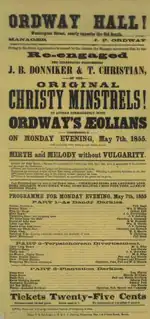 Ordway was born in Salem, Massachusetts. In the mid-1840s John Ordway and his father Aaron opened a music store in Boston. John was also a music publisher and composer; his song Twinkling Stars are Laughing, Love (1855) was recorded by the Hayden Quartet as late as 1904. Around 1845 he organized Ordway's Aeolians, a blackface minstrel troupe[2] which performed at Ordway Hall in Boston and also nationally to promote Ordway's publishing business.[3][4] Future bandleader/composer Patrick Gilmore worked in Ordway's store and also appeared with the Aeolians. James Lord Pierpont's first major composition "The Returned Californian" in 1852 was written expressly for Ordway and his troupe. A number of 19th century songs were written for the Aeolians and/or dedicated to Ordway, including Jingle Bells.[5][6][7]