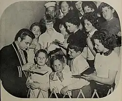 Cash enlisted in the Air Force on July 7, 1950, shortly after the start of the Korean War.[33] After basic training at Lackland Air Force Base and technical training at Brooks Air Force Base, both in San Antonio, Texas, Cash was assigned to the 12th Radio Squadron Mobile of the U.S. Air Force Security Service at Landsberg, West Germany. While in San Antonio, he met Vivian Liberto, a woman of Sicilian, Irish and German ancestry. They dated briefly before his departure. During the years he served overseas, they exchanged thousands of letters. He worked in West Germany as a Morse code operator, intercepting Soviet Army transmissions. While working this job, Cash was said to be the first American to be given the news of Joseph Stalin's death (supplied via Morse code). His daughter, Rosanne, said that Cash had recounted the story many times over the years.[34][35][36] While at Landsberg, he created his first band, "The Landsberg Barbarians".[37] On July 3, 1954, he was honorably discharged as a staff sergeant, and he returned to Texas.[38] During his military service, he acquired a distinctive scar on the right side of his jaw as a result of surgery to remove a cyst.[39][40] Soon after his return, Cash married Vivian Liberto in San Antonio. She had grown up Catholic and was married in the church by her paternal uncle, Father Franco Liberto.