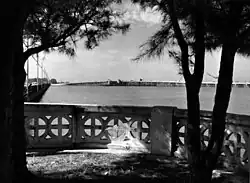The causeway and its original bridge were built in 1925 by John Ringling, who owned large tracts of land on both Lido and Longboat Keys. Ringling wanted to develop the islands and financed the cost of the bridge at the cost of approximately $750,000, equivalent to $13.4 million in 2024[5], to connect the islands with the mainland.[6] The ornate bridge opened for traffic on February 7, 1926. It was labeled "one of the greatest engineering accomplishments in the South” by the Sarasota Herald, which also proclaimed, “There are no words adequate with which to express our appreciation.”[4][7] The original bridge began at the south end of Golden Gate Point in Sarasota.[8] Ringling donated the bridge to the city in 1927.
