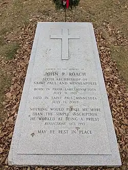 Roach died of heart failure on July 11, 2003, at the Little Sisters of the Poor home in St. Paul at the age of 81.[14] Over 2,500 attended his funeral at the Cathedral of Saint Paul, including 300 priests and 15 bishops.[12] Minnesota Governor Tim Pawlenty and former vice-president Walter Mondale were also in attendance.[12] The sermon was given by Bishop John Kinney.[35] Roach was buried at Resurrection Cemetery in Mendota Heights.[36]