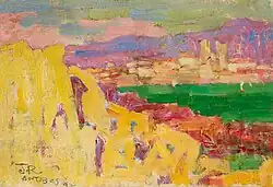 Claude Monet often worked with Russell at Belle Île and influenced his style, though it has been said that Monet preferred some of Russell's Belle Île seascapes to his own. In 1890, Russell left Belle Île and traveled to Antibes in a horse-drawn cart, where he rented a house for the winter and produced some of his most acclaimed work.[6] Due to his substantial private income Russell did not attempt to make his pictures well known. In the 1880s and 1890s, Russell hewed closely to pure French impressionist style.[8]