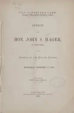 John Sharpenstein Hager (March 12, 1818 – March 19, 1890) was an American politician from New Jersey who represented the state of California in the U.S. Senate from 1873 to 1875. He was a Democrat.