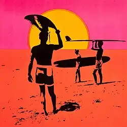 In 1964, Van Hamersveld was a student at the Art Center College of Design and the art director of Surfing Illustrated magazine and Surfer magazine. Van Hamersveld was also a local surfer and was hired by director and filmmaker Bruce Brown to design the iconic Endless Summer movie poster using a photograph taken by Bob Bagley, general manager and cameraman for Bruce Brown Films.[6] To produce the image that would become iconic, he organized a photo session with the producer and the two stars at Salt Creek Beach in Dana Point. Using photo techniques for the central image and hand-lettering the title Van Hamersveld created a "national phenomenon" image that has endured as a classic. He was paid $150 for the art. The poster is featured in the National Museum of American History section of the Smithsonian Institution, The Museum of Modern Art, and The Los Angeles County Museum of Art.[7]