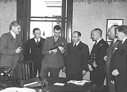 In October 1945, following the surrender of Japan, O'Brien was appointed the head of the Australian Scientific Mission.[30] As such, he worked closely with both the British Commonwealth Occupation Force and headed the Science and Technology Division of the Economic and Scientific Section at the headquarters of the Supreme Commander for the Allied Powers. As such, he travelled extensively around Japan.[31] In October 1948, he was appointed the president of a military court convened to try Admiral Soemu Toyoda, the former commander of the Japanese Combined Fleet.[32] After a lengthy trial that dragged on until 6 September 1949, the seven-member court acquitted Toyoda. Toyoda became the last top-level Japanese official to be tried for war crimes, and the only one to have all the charges against him dismissed.[33]