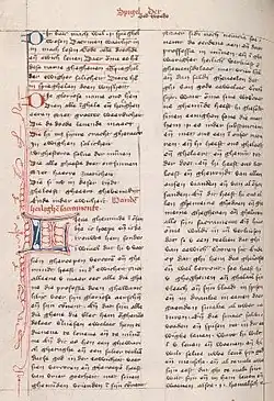Around 1340, Ruysbroeck wrote his masterpiece, The Spiritual Espousals. The 36 surviving Dutch manuscripts, as well as translations into Latin and Middle High German, are evidence of the book's popularity. Some of the text was also translated into Middle English (via the Latin translation) as The Chastising of God's Children (which was later printed by Wynkyn de Worde).[5] Around the same time, he also wrote a short treatise, The Sparkling Stone,[4] which was also translated into Middle English.[6]
