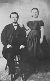 According to Josephine, at some point she felt ill and returned to her parents' home in San Francisco. She said Behan followed her and persuaded her parents to approve their engagement. Some modern researchers question the likelihood that her father, a Reform Jew, would approve her union with Behan, an unemployed office-seeker, 14 years older than his daughter, a Gentile, and a divorced father.[24] Sadie later said Behan told her parents that he couldn't leave his livery stable business for a wedding in San Francisco[16][25] and Sadie said her parents approved their engagement.[14]