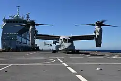 One of the first exercises during Cougar 15 was Corsica Lion, where Bulwark, Ocean, MV Hartland Point and the French Navy's Dixmude practised rescuing "civilians" off the northern coast of Corsica.[47] The RFTG also exercised with Standing NATO Maritime Group 2.[48] As part of Cougar 15, United States Marine Corps MV-22 Ospreys flew off Ocean during Exercise Blue Raptor, transporting Royal Marines from ship to shore. This exercised ended around 24 November 2015.[49][50] Bulwark temporarily remained in Malta along with HMS Somerset to provide security for the Commonwealth Heads of Government Meeting 2015.[51] This security arrangement ended with Queen Elizabeth II visiting Bulwark and the ship returned to its home port on 7 December 2015.[52][53]