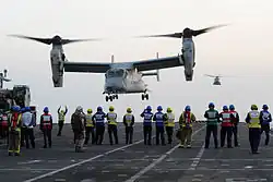 During mid September 2013, Response Force Task Group deployed East of Suez for the second phase of the Cougar 13 deployment where it linked up with the Royal Saudi Navy for exercise 'Red Alligator'.[28] While East of Suez, a Bell-Boeing V-22 Osprey from USS Kearsarge landed on Illustrious in a joint exercise with the United States Navy. Likewise, Illustrious's Army Air Corps Westland Lynx and Westland Sea Kings dropped in on Kearsarge, carrying a few passengers to get a brief insight into the American LHD.[29] In the Gulf of Oman, Response Force Task Group conducted anti-submarine drills against USS Dallas.[30] HMS Quorn briefly met up with the RFTG for exercise 'Sea Khanjar'.[31] Exercise 'Sea Khanjar' was observed by Fleet Commander Vice Admiral Philip Jones, Commandant General Royal Marines Major General Ed Davis, Lieutenant General Mike Hindmarsh and Commander United Arab Emirates Presidential Guard Marines, Colonel A Al-Tenaji.[32]