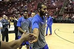 On November 8, 2013, Horford posted a career high 12 rebounds against the UMass Lowell in the season opener.[23][24] In the subsequent game against South Carolina State on November 12, Horford again established a career high of 15 rebounds and added 9 points leaving him a point shy of a double-double.[25][26] Prior to the game, the last time a Michigan Wolverine had posted 15 or more rebounds was when Manny Harris posted 16 on December 29, 2008, against North Carolina Central.[27][28] In the January 2 Big Ten Conference opener against Minnesota at the Williams Arena, Horford established a new career high with 14 points and added 9 rebounds.[29][30] On March 4, Horford had 10 rebounds against Illinois to help Michigan clinch its 14th and 8th outright Big Ten Conference championship.[31][32] The 2013–14 team advanced to the elite eight round of the 2014 NCAA Men's Division I Basketball Tournament before being eliminated by Kentucky.[33] Horford announced on April 10 that he would use his 5th year of redshirt eligibility by transferring to a graduate program at another school. Because he graduated in April, he was eligible to immediately join another team for the 2014–15 NCAA Division I men's basketball season.[34] On April 26, Horford announced he was transferring to play for the Florida Gators men's basketball team.[35]