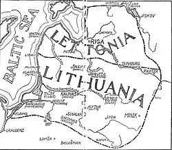 According to Šliūpas memoirs, professor James Young Simpson invited him to the United Kingdom on behalf of the Foreign Office.[151] He arrived to London on 4 February 1919. He delivered speeches on Lithuania's independence to the Union of Democratic Control as well as Lithuanian immigrant communities in London, Glasgow, Burnbank, Edinburgh, Liverpool, Manchester. He also held talks with Latvian activists promoting his ideas of a Lithuanian–Latvia union.[152] When Lithuania sent its official representative Vincas Čepinskis in mid-April 1919, Šliūpas departed to the Paris Peace Conference on 22 May.[153] Together with his son-in-law Yčas, Šliūpas worked to purchase $5 million (equivalent to $90,681,000 in 2024) worth of various military goods from the U.S. Liquidation Commission (instead of transporting various supplies back to United States, the U.S. Army sold surplus goods to other governments and businesses).[154] Šliūpas personally supervised the purchase of medical supplies worth about $500,000 in Saint-Nazaire and accompanied their delivery to Lithuania. It was the first time that Šliūpas returned to Lithuania since 1883.[155] But he did not stay there for long as he was sent as the first Lithuanian diplomatic representative to Latvia in August 1919. With military attaché Ladas Natkevičius, he also represented Lithuania to Estonia.[156] There is little information available on his activities in Latvia. At the time, Latvia was fighting the West Russian Volunteer Army but Lithuania refused to provide aid and Lithuania avoided establishing diplomatic contacts with the Soviet Russia due to its international isolation – positions that Šliūpas appears to have disagreed with.[157][158] He also did not get along with Zigfrīds Anna Meierovics, Latvian Foreign Minister.[159] He resigned in December 1919 and returned to Lithuania.[160]