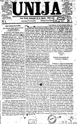 Šliūpas arrived to New York City on 16 June 1884.[46] He did not speak English and tried assorted jobs for a few months until he established contacts with Lithuanian Americans.[47] He met Mykolas Tvarauskas who owned a small printing shop and was the publisher of the first Lithuanian American newspaper Gazieta lietuviška in 1879–1880.[48] Together they established the Lithuanian-language weekly newspaper Unija (Union). Initially, the idea was to publish the newspaper both in Polish and Lithuanian, but they could not get enough Polish subscribers due to Šliūpas' focus on the Lithuanian National Revival.[49] The first issue was published on 25 October 1884. It was a small four-page publication that mainly printed Šliūpas' texts that focused on Lithuania's revival, promoted a union with Latvia, discussed children's education, advanced freethinking and socialist ideas. It also published the first poems by Šliūpas' fiancé who stayed behind in Mitau.[50] At the end of 1884, the newspaper had just 250 subscribers.[51] Šliūpas lived together with Tvarauskas in the same room as the printing press – the conditions were very poor and cramped.[52] At the same time, Šliūpas joined the Mutual Aid Society of Saint Casimir at the Polish St. Stanislaus Bishop and Martyr Church and started working on organizing a separate Lithuanian parish to combat Polonization via churches.[53] In April 1885, a Polish committee invited Lithuanians to participate in a parade and fundraising celebrating the Constitution of 3 May 1791. Šliūpas responded in Unija calling Lithuanians to reject the invitation as it was a Polish, not a Lithuanian celebration.[54] This elicited protests from Polish groups as well as from within the Mutual Aid Society of Saint Casimir and, on 27 April, Tvarauskas fired Šliūpas leaving him with no money or a place to stay.[55]