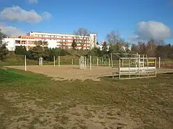 The stadium underwent a phased reconstruction process. In 2017, a modular, movable grandstand was installed on the eastern perimeter, designed to serve either the main stadium, or the adjacent artificial pitch, with a flexible configuration allowing mixed in-between utilization between the two.